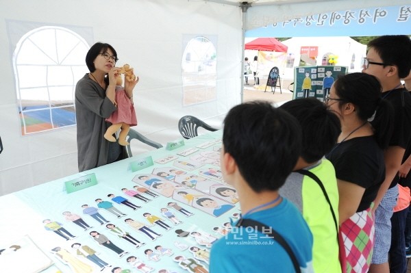 21일 경기 오산시는 시청 중앙광장에서 '성평등정착을 위한 장애아동·청소년 폭력예방 체험활동 스텝업' 행사를 열었다. 사진은 체험부스에서 강사가 어린이들에게 행사에 대해 설명하는 모습.(사진제공=오산시청)