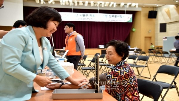 지난 20일 서울 노원구는 구청 대강당에서 상계백병원, 원자력병원, 을지병원 등 지역내 의료기관 6곳과 함께 의료 취약계층을 대상으로 '연합 진료봉사'를 실시했다. 사진은 의료진이 노인의 혈압을 재고 있는 모습.(사진제공=노원구청)