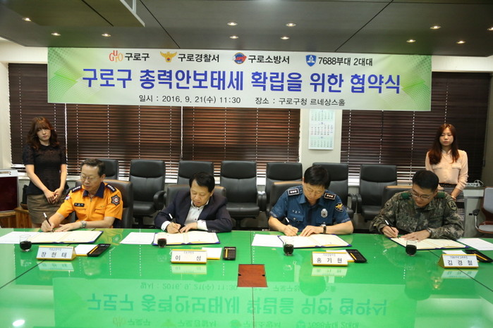 지난 21일 구로구청 3층 르네상스홀에서 열린 ‘구로구 총력안보테세 확립을 위한 협약식’에서 이성 구청장(왼쪽 두 번째)이 구로소방서장 등 관계자와 함께 협약서에 사인을 하고 있다.(사진제공=구로소방서)