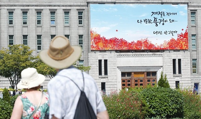 22일 서울도서관 정면 외벽에 있는 대형 글판인 서울꿈새김판 앞으로 외국인들이 지나가고 있다. 올해 서울꿈새김판 가을편 문구는 ‘계절을 건너며 나 또한 풍경이 돼… 너라고 안 그럴까’이다.