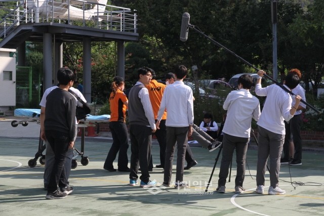 최근 서울 관악소방서는 지역내 서울정보산업고등학교에서 청소년119소방안전뉴스 촬영지원을 진행했다. 사진은 학생들이 운동장에서 일어나는 CPR사고 촬영지원을 하는 모습.(사진제공=관악소방서)