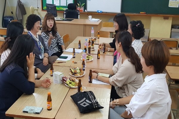 지난 21일 경북 구미 도봉초등학교는 도봉관에서 공감과 소통의 학교 문화 창출을 위한 2016학년도 2학기 학교교육 설명회를 개최했다. 사진은 설명회에 참여한 학부모들이 교사와 이야기를 나누는 모습.(사진=구미교육지원청)