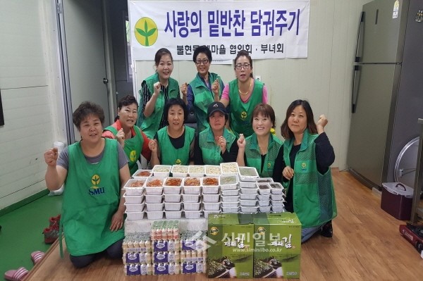 최근 경기 동두천시 불현동 새마을부녀회는 밑반찬(배추김치, 오징어무침, 탕수육, 깻잎, 김) 5종 세트를 만들어 홀몸노인, 장애인가구 등 틈새가정 17가구에 전달했다. 사진은 부녀회 관계자들이 기념촬영을 하는 모습.(사진제공=동두천시청)