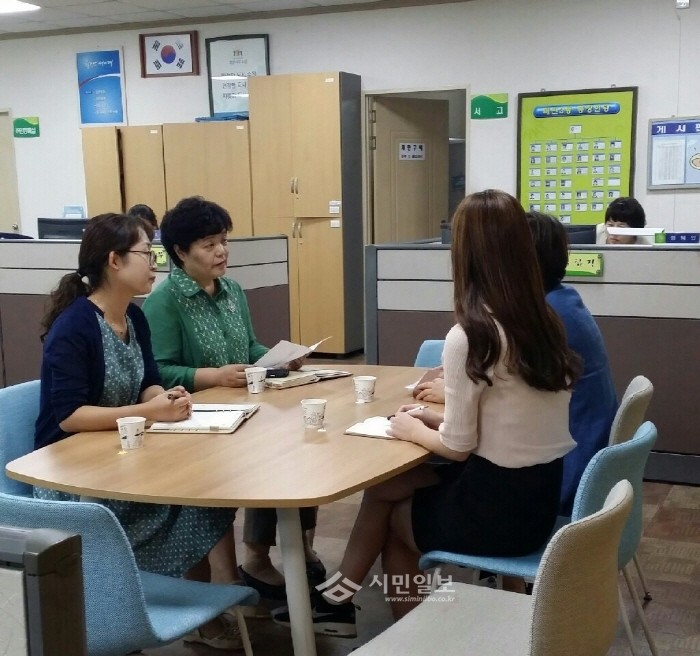 경기 수원시 영통구는 최근 지역내 10개동 주민센터를 순회하며 사회복지통합업무 처리 능력 향상을 위한 멘토링day를 실시했다. 사진은 구청 관계자가 사회복지공무원들과 대화를 하는 모습.(사진제공=영통구청)