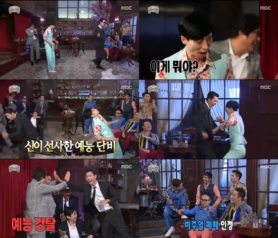 그는 입에 물을 머금고 뿜어내는가 하면 끊임없이 긴 팔과 다리를 이용해 춤췄고 이를 본 유재석은 연신 감탄하면서도 그와 함께 춤을 춰 시청자들에게 웃음을 선사했다.
