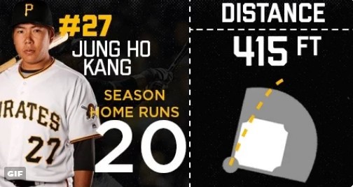 26일(한국시작) 워싱턴 내셔널스와의 경기에 출전한 강정호는 4번 타자 3루수로 선발 출장, 시즌 20호 홈런 포함 4타수 2안타 3타점 1득점을 기록했다.