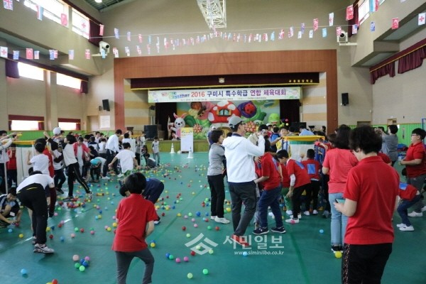 지난 23일 경북 구미교육지원청은 구미혜당학교 체육관에서 지역내 초등특수교육 대상학생 200여명이 참가한 가운데 '2016 구미시 특수학급 연합체육대회'를 개최했다. 사진은 참가자들이 체육대회를 진행하고 있는 모습.(사진제공=구미교육지원청)
