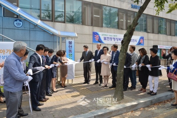 최근 경기 동두천시 불현동 행정복지센터는기존 주민센터에서 행정복지센터로 명칭과 기능을 새롭게 개편한 것을 기념하기 위한 현판식을 개최했다. 사진은 오세창 시장(가운데 오른쪽)과 장영미 의장 등이 현판식을 진행하는 모습.(사진제공=동두천시청)