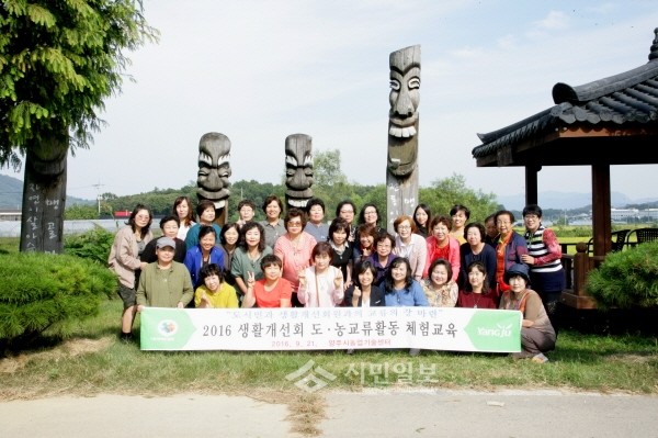 경기 양주시농업기술센터 최근 소비자와 생산자의 협력구축을 위해 '2016년 생활개선회 도·농교류 활동지원 체험교육'을 진행했다. 사진은 행사에 참여한 관계자들이 기념촬영을 하는 모습.(사진제공=양주시청)