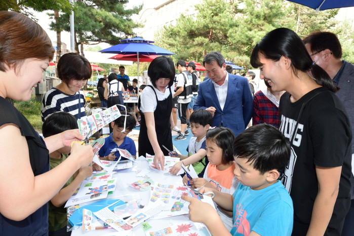 지난 24일 중랑구는 면목4동 샘터공원에서 생활 속 안전을 테마로 하는 ‘ㅎㅎㅎ(환하게 함께 활기차게)안심장터’를 열었다. 사진은 나진구 구청장(가운데)이 참여 아이들과 함께 안심 팝업북 만들기 체험을 하고 있는 모습.(사진제공=중랑구청)
