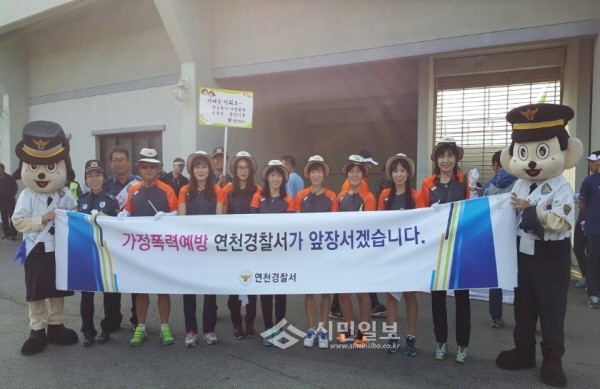최근 경기 연천경찰서는 연천 공설운동장에서 개최된 제48회 연천군민의 날 기념식 및 체육대회 행사에 참석했다. 사진은 4대 사회악 예방 홍보활동을 진행한 여성청소년계 직원들이 기념촬영하는 모습.(사진제공=연천경찰서)
