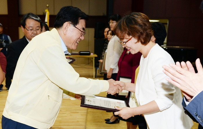 지난 26일 동대문구는 구청 다목적 강당에서 동대문구사회복지협의회 주관으로 제17회 사회복지의 날을 기념하기 위한 ‘2016년도 동대문구 사회복지대회’를 개최했다. 사진은 유덕열 구청장(왼쪽)이 유공자에게 표창을 수여하는 모습.(사진제공=동대문구청)