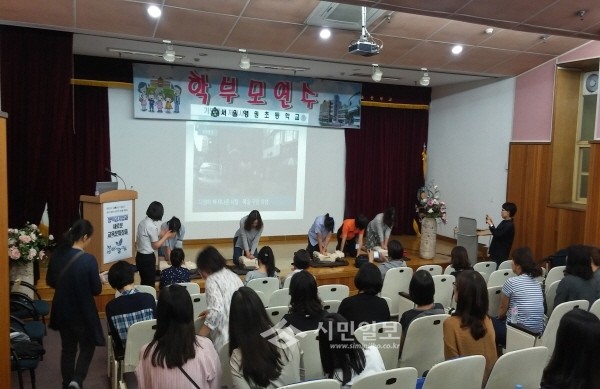 지난 26일 서울 영등포소방서는 영원초등학교 관계자 및 녹색어머니회 시민들을 대상으로 '소방안전교육'을 실시했다. 사진은 교육 참여자들이 심폐소생술 실습을 하는 모습.(사진제공=영등포소방서)