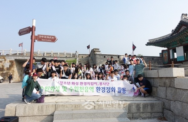 지난 25일 경기 수원시 팔달구는 청소년 봉사단 ‘청소년 수원화성 환경지킴이’와 '수원시금빛봉사회'가 참여한 가운데 수원화성 일원에서 '환경정화활동'을 실시했다. 사진은 참여자들이 기념촬영을 하는 모습.(사진제공=팔달구청)