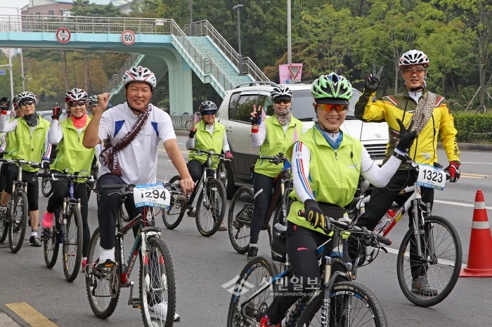 최근 서울 강동구 암사동 유적지에서 자전거 이용 활성화와 강동선사문화축제의 성공을 기원하며 열린 ‘2016. 강동구민 자전거 대행진’에 참가한 조동탁 의장(1294번)이 구민과 함께 자전거를 타며 파이팅을 외치고 있다.(사진제공=강동구의회)