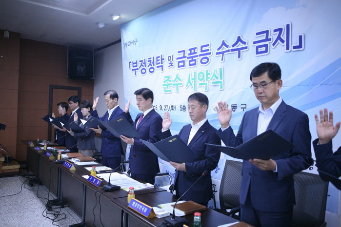 최근 강동구청 대강당에서 5급 이상 간부 공무원을 대상으로 실시된 ‘청탁금지법 준수 및 실천의지 다짐을 위한 서약식’에 참가한 이해식 구청장(오른쪽 세 번째)이 선서를 하고 있다.(사진제공=깅동구청)