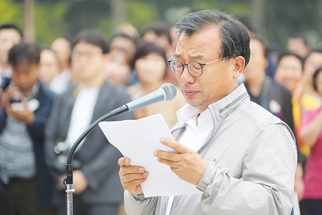 사흘째 단식을 이어가고 있는 새누리당 이정현 대표가 28일 오후 국회 본청 앞에서 열린 ‘정세균 의장 사퇴 관철을 위한 새누리당 당원 규탄 결의대회’에서 발언을 하던 중 눈시울을 붉히고 있다.