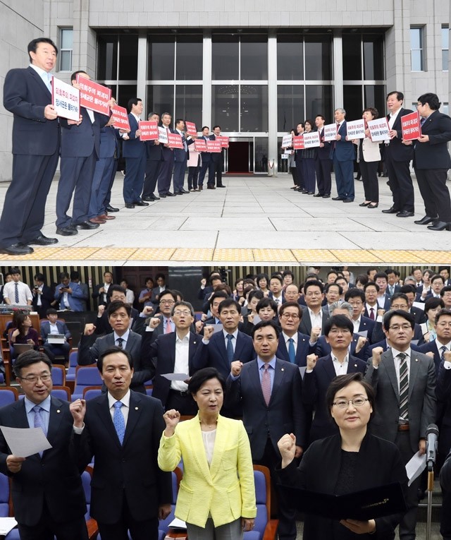 새누리당 의원들이 28일 오전 서울 여의도 국회 본청 앞에서 피켓 시위를 통해 정세균 국회의장의 사퇴를 촉구하고 있다(위). 더불어민주당 추미애 대표(앞줄 오른쪽)와 우상호 원내대표 등 의원들이 28일 오전 국회에서 열린 의원총회에서 국정감사 정상화 및 김재수 장관 해임을 촉구하는 구호를 외치고 있다.