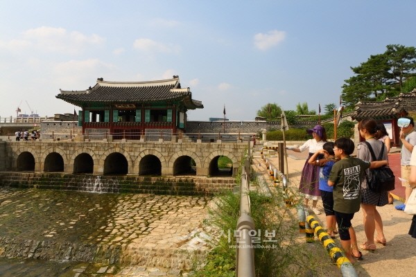 | ▲수원 시티투어 참가자들이 수원화성의 북쪽 수문인 화홍문을 견학하고 있다.(사진제공=경기관광공사) | ||