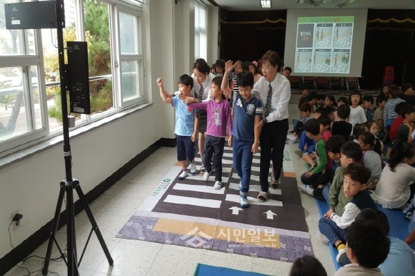 최근 경북 구미시 야은초등학교는 1·2학년 저학년 학생들을 대상으로 도로교통공단에서 실시하는 교통안전 강의 및 실습을 실시했다. 사진은 학생들이 간이 횡단보도에서 길을 건너는 실습을 진행하는 모습.(사진제공=야은초등학교)
