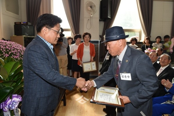 최근 경기 하남시는 하남노인복지회관에서 노인회지회 회원과 각급기관단체장 등 500여명이 참석한 가운데 '제20회 노인의 날 기념행사'를 개최했다 사진은 이종수 하남시장 권한대행(왼쪽)이 모범노인들에게 표창을 수여하는 모습.(사진제공=하남시청)