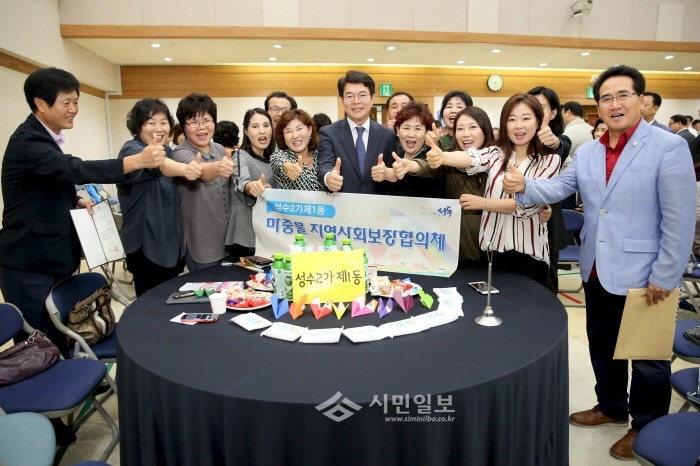 최근 서울 성동구는 구청 3층 대강당에서 17개 동 지역사회보장협의체 위원 및 관계자 250명이 참석해 '성동구 동 마중물 지역사회보장협의체 발대식'을 개최했다. 사진은 정원오 구청장(가운데)과 관계자들이 엄지를 내밀며 기념촬영하는 모습.(사진제공=성동구청)