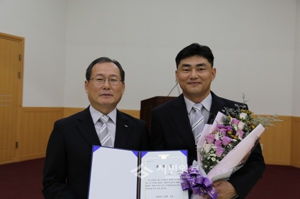 4일 경기 여주소방서는 대회의실에서 3분기 모범공무원에 선정된 현장대응단 유병화 소방장에 대해 '세종의 얼이 깃든' 모범공무원 시상식을 열었다. 사진은 김오년 서장(왼쪽)과 유 소방장이 기념촬영하는 모습.(사진제공=여주소방서)