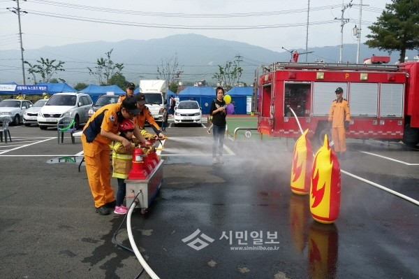 최근 경기 포천시는 포천소방서, 시 자율방재단, 의용소방대 등 40여명과 함께 ‘지진 발생시 국민행동요령’을 홍보하는 ‘제247차 안전점검의 날’ 행사를 개최했다. 사진은 어린이들이 소화기 안전체험을 하고 있는 모습.(사진제공=포천시청)