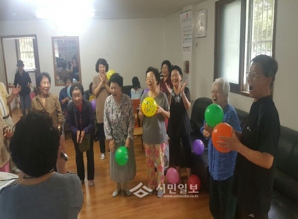 지난 4일 경기 수원시 매탄1동 매여울 봉사단은 주공5단지 아파트 경로당에서 웃음치료 프로그램 ‘어르신들과 함께하는 아름다운 동행’을 진행했다. 사진은 노인들이 풍선을 들고 즐거워하는 모습.(사진제공=영통구청)
