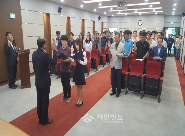 지난 4일 경기 오산시 환경사업소는 1층 홍보관에서 '청탁금지법' 준수를 다짐하는 '반부패·청렴 실천 다짐대회'를 개최했다. 사진은 사업소 직원들이 청탁금지법 서약을 다짐하는 선서를 하고 있는 모습.(사진제공=오산시청)