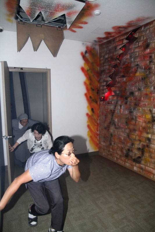 최근 은평소방서는 4층 대강당에서 지역내 67곳 노유자생활시설 관계자들이 참석한 가운데 안전관리 간담회를 가졌다. 사진은 간담회 후 참여자들이 열·연기 피난체험을 하는 모습.(사진제공=은평소방서)