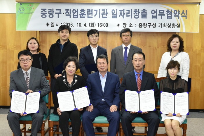 지난 4일 나진구 중랑구청장(앞줄 가운데)이 구청 기획상황실에서 지역내 직업훈련기관 9곳과 ‘민·관 일자리창출 업무 협약식’을 개최한 후 기념 촬영을 하고 있다.(사진제공=중랑구청)