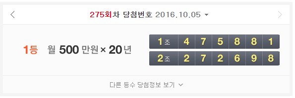 한편 275회 연금복권 당첨번호는 1조 475881, 2조 272698이다.