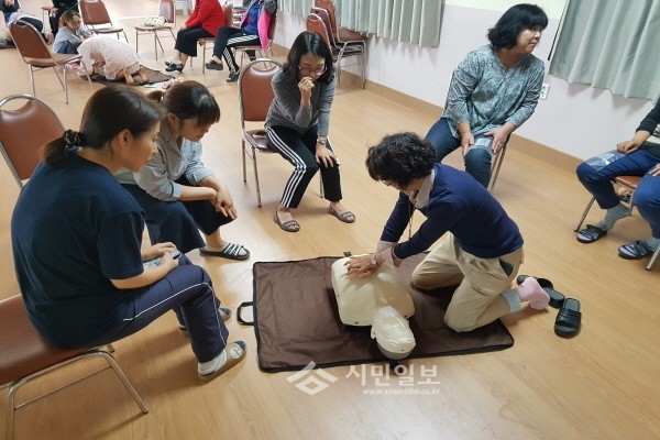 지난 5일 경기 이천소방서는 설봉초등학교 교직원을 대상으로 응급처치 능력을 향상으로 소중한 생명을 살리기 위한 '응급처치교육'을 실시했다. 사진은 교육에 참여한 교직원들이 심폐소생술 실습을 하는 모습.(사진제공=이천소방서)