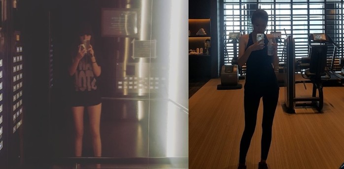 왼쪽에서는 늘씬한 각선미가 드러나는 핫 팬츠를 입고 셀카를 찍고있다.오른쪽의 공현주는 헬스장에서 자신의 모습을 확인하고 있다. 군살없는 라인이 보는 이들의 시선을 사로잡고 있다.
