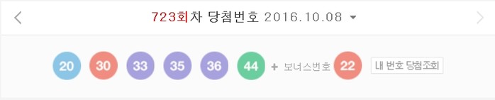 로또 723회 당첨번호 " 20 30 33 35 36 44 ' 보너스 번호 22