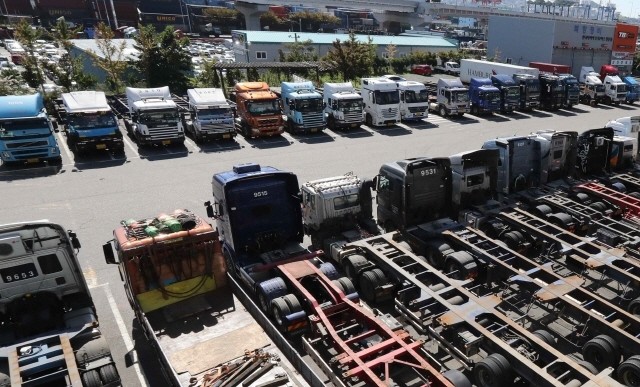 9일 부산 남구 감만부두에 있는 한 주차장에 멈춘 화물차로 가득 차 있다. 화물연대는 10일 0시를 기해 운송거부에 들어간다.
