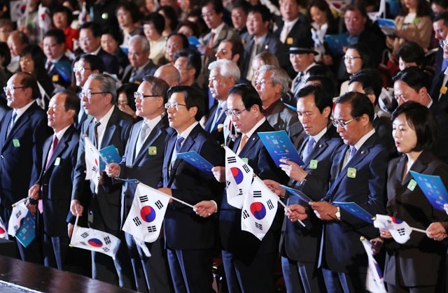 9일 오전 서울 세종문화회관에서 열린 ‘570돌 한글날 경축식’에서 황교안 국무총리와 조윤선 문화체육관광부 장관 등 참석자들이 한글날 노래를 제창하고 있다.
