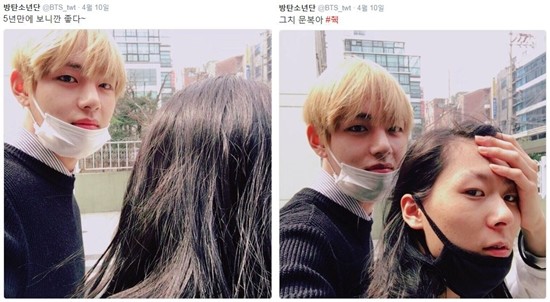 지난 4월 뷔는 방탄소년단 공식 SNS를 통해 “5년만에 보니깐 좋다~”라는 글과 한 장의 사진을 게재했다.