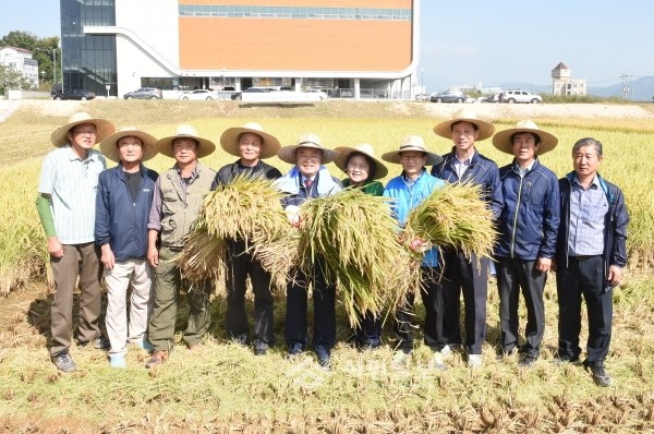 최근 경기 양주시는 광사동 체험관광농원에서 '벼 베기 시연회'를 개최했다. 사진은 이성호 시장(왼쪽에서 다섯 번째)이 참여자들과 함께 벼를 들고 기념촬영을 하는 모습.(사진제공=양주시청)
