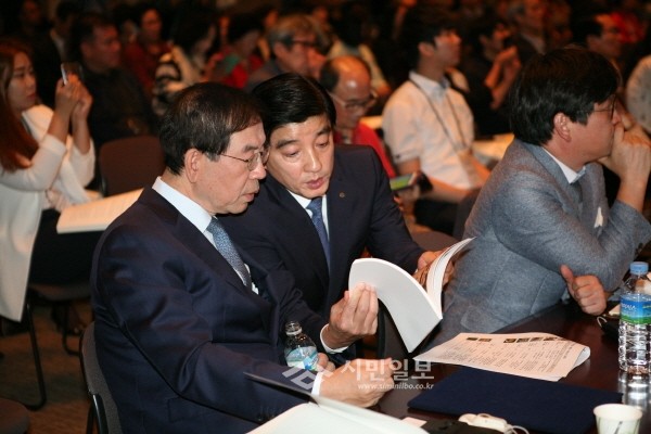 최근 서울 강동구는 한국프레스센터 국제회의장에서 '신석기 문화의 지역적 양상과 선사유적 보존'을 주제로 국제학술회의를 개최했다. 사진은 박원순 시장(왼쪽)과 이해식 구청장이 논문을 살펴보며 이야기를 나누는 모습.(사진제공=강동구청)