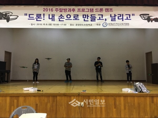 지난 8일 충남 아산교육지원청은 지역내 초등학교 학생 56명을 대상으로 온양천도초등학교에서 ‘드론! 내 손으로 만들고, 날리고’드론 체험 캠프를 진행했다. 사진은 학생들이 직접 만든 드론을 조종하는 모습.(사진제공=아산교육지원청)