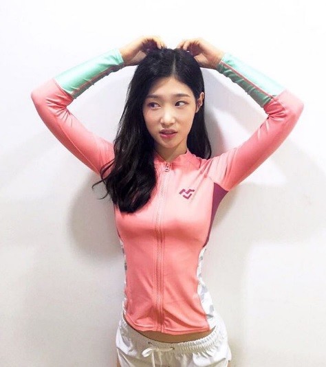 정채연은 은은한 분홍색과 푸른색으로 디자인된 래쉬가드를 입고 곁눈질을 하고 있다. 특히 갸냘픈 몸매와 청순한 이미지가 인상적이다.