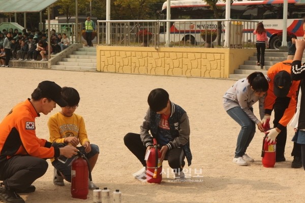경기 부천시 동산초등학교는 11일 내동119 안전센터의 협조 아래 비상시 초기 대응력 제고를 위한 '2016년 합동 소방훈련'을 실시했다. 사진은 소방관들이 학생들에게 소화기 사용법에 대해 알려주는 모습.(사진제공=부천교육지원청)