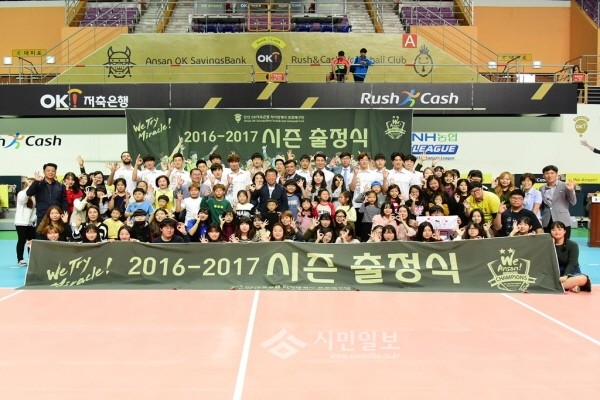 최근 경기 안산 상록수체육관에서 2016~2017시즌 V리그 개막을 앞두고 열린 ‘안산OK저축은행 배구단 출정식’에 참여한 제종길 시장과 300여명의 팬이 안산OK저축은행 배구단과 함께 기념촬영을 하고 있다.(사진제공=안산시청)
