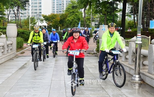 최근 인천 부평구는 구청 어울림마당에서 홍미영 구청장과 임지훈 구의장을 비롯해 직원 80여명이 참가한 가운데 ‘2016 굴포천 일주 자전거 퍼레이드’를 개최했다. 사진은 홍 구청장(가운데)이 자전거를 타고 있는 모습.(사진제공=부평구청)