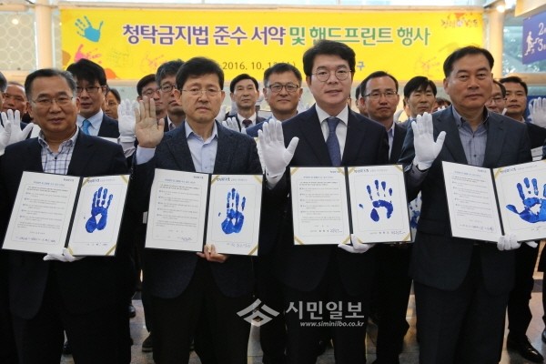 12일 서울 성동구가 구청 1층 비전갤러리에서 청탁금지법 준수 서약 및 청렴실천 핸드프린트 행사를 개최한 가운데 정원오 구청장(오른쪽에서 두번째)를 비롯한 간부공무원들이 손도장을 찍은 뒤 선서하고 있다.(사진제공=성동구청)