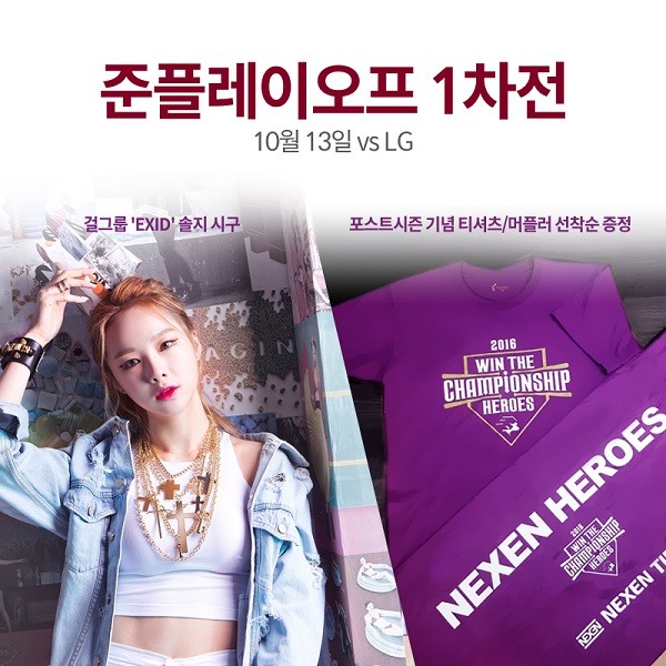 넥센 히어로즈는 "13일 오후 6시 30분에 고척 스카이돔에서 펼쳐지는 LG트윈스와의 2016 타이어뱅크 KBO 준플레이오프 1차전에 걸그룹 EXID의 솔지를 시구자로 선정했다"고 발표했다.