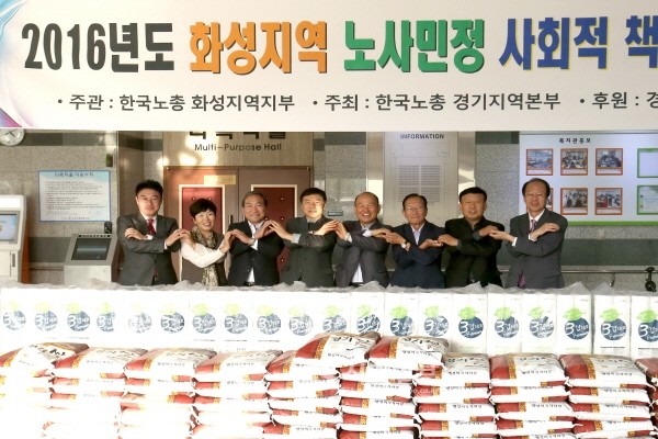 지난 12일 경기 화성시 노사민정협의회는 화성시근로자종합복지관에서 '2016년 하반기 회의'를 개최하고, 지역사회 나눔을 실천하는 '쌀 전달식'을 열었다. 사진은 전달식에 참여한 관계자들이 기념촬영을 하는 모습.(사진제공=화성시청)