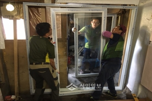 최근 경기 양주시 양주1동 감동365추진협의체 나눔복지분과는 소외된 취약계층을 위한 ‘사랑의 집 고치기’ 행사를 실시했다. 사진은 참여자들이 한파에 취약한 출입문을 교체하는 모습.(사진제공=양주시청)